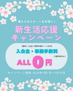 キャンペーン期間中のご入会で入会金・事務手数料どちらも0円にさせていただきます!!
